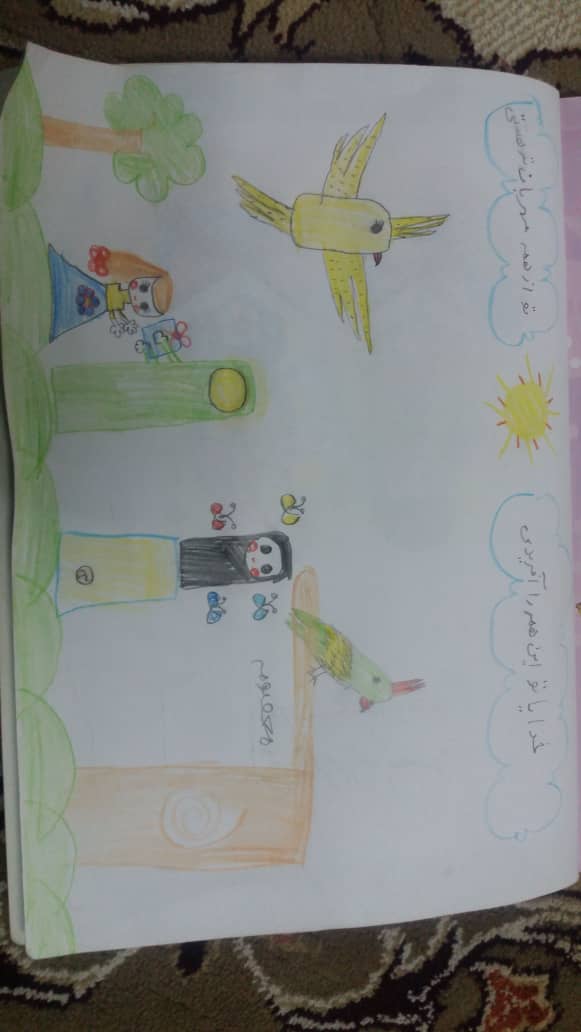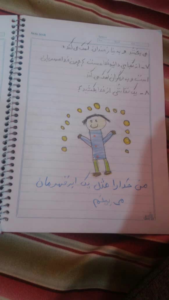 سوال پنجم :خداچه شکلیه ؟نداگفت :مامانم گفته خداتوقلب آدماس .هدی گفت :نمیدونه کسی چون کسی اونوندیده .اسراء گفت :خداسفیده .